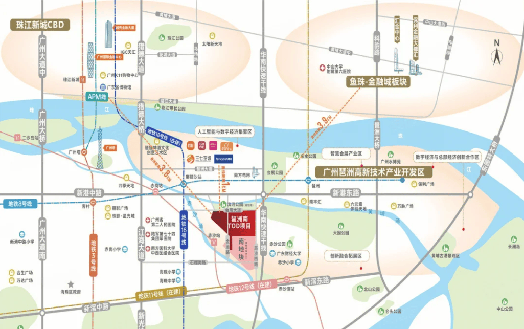 越秀琶洲南TOD项目位广东省广州市海珠区金运路1号,海珠赤沙TOD地块东侧紧挨华南快速干线,北侧隔着黄埔涌,对岸就是高楼林立的电商总部琶洲西区。
